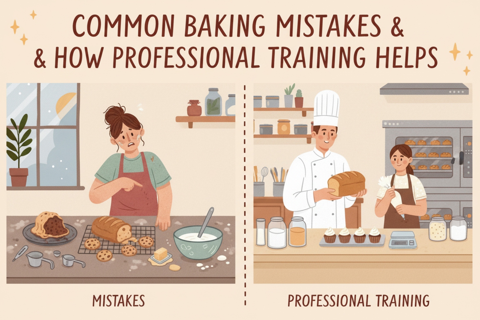 Common baking mistakes are part of every baker’s journey, but leaving them uncorrected can slow progress. Professional training plays a vital role in identifying errors and teaching effective solutions. By mastering measurements, techniques, timing, decoration, and hygiene, bakers gain confidence and consistency. With proper guidance and hands-on experience, learners can overcome mistakes and move toward successful, high-quality baking with confidence.