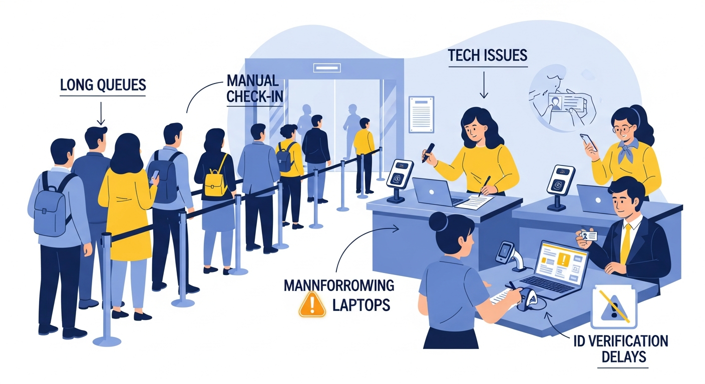 Old check-in methods take a lot of time. Each person has to be checked in manually. That slows things down. Names may be misspelled on the list. Phone numbers may be wrong. Some names may appear twice. Small mistakes like these cause big delays. People get tired of waiting and start to feel annoyed.