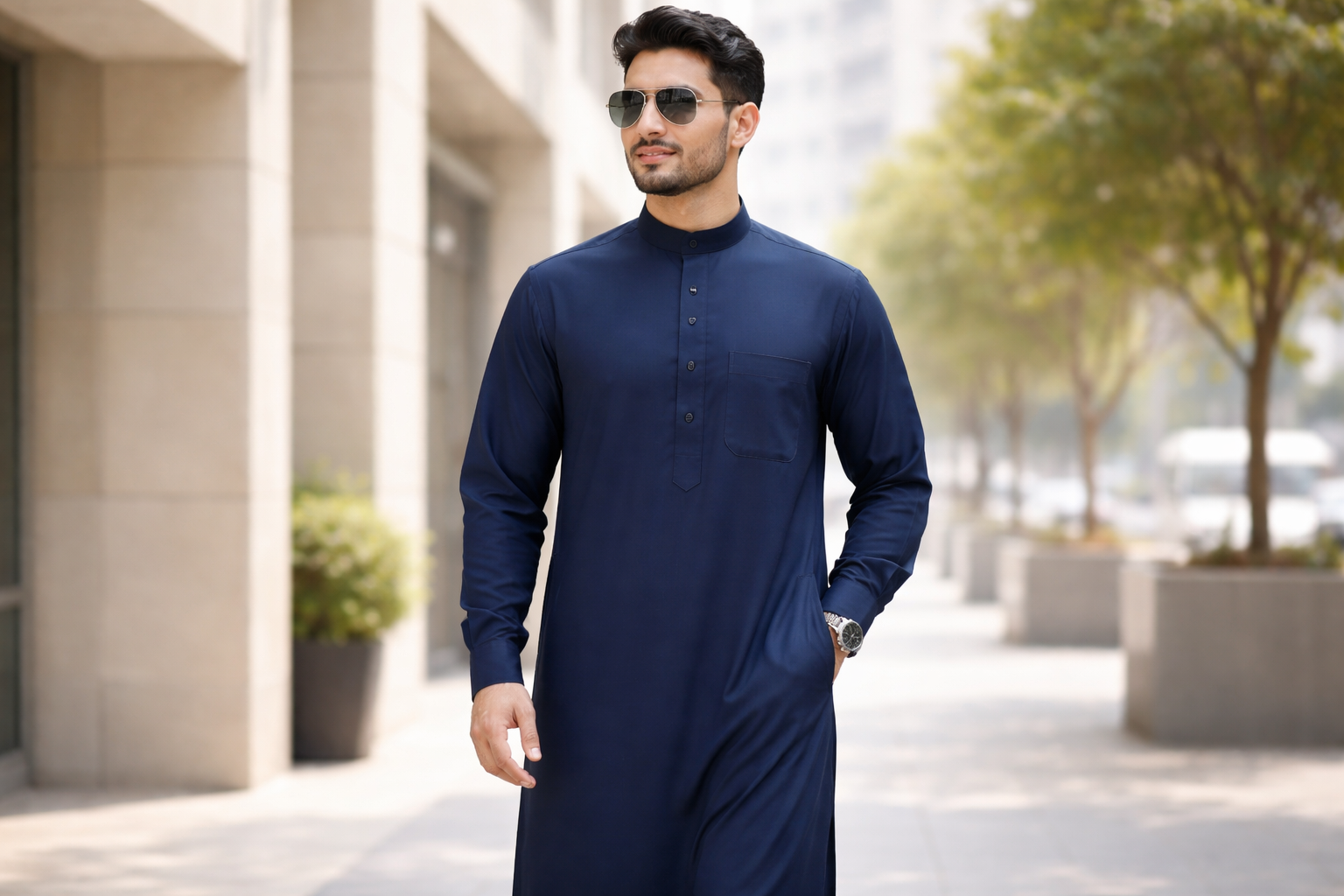 - Footwear: It is compatible with black, dark brown, and even tan leather footwear. The ability to wear tan or “camel” colored sandals with a navy thobe is a popular modern trend that creates a sharp, stylish contrast.