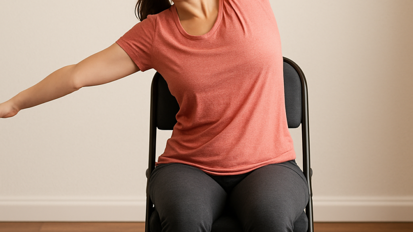 The Chair Cat-Cow sequence is a gentle spinal flexion and extension exercise designed to increase mobility and reduce stiffness. Starting with hands placed on the knees, the practitioner inhales while arching the back, lifting the chest, and tilting the pelvis forward (Cow). On the exhale, they round the spine, tuck the chin, and pull the belly button toward the spine (Cat).